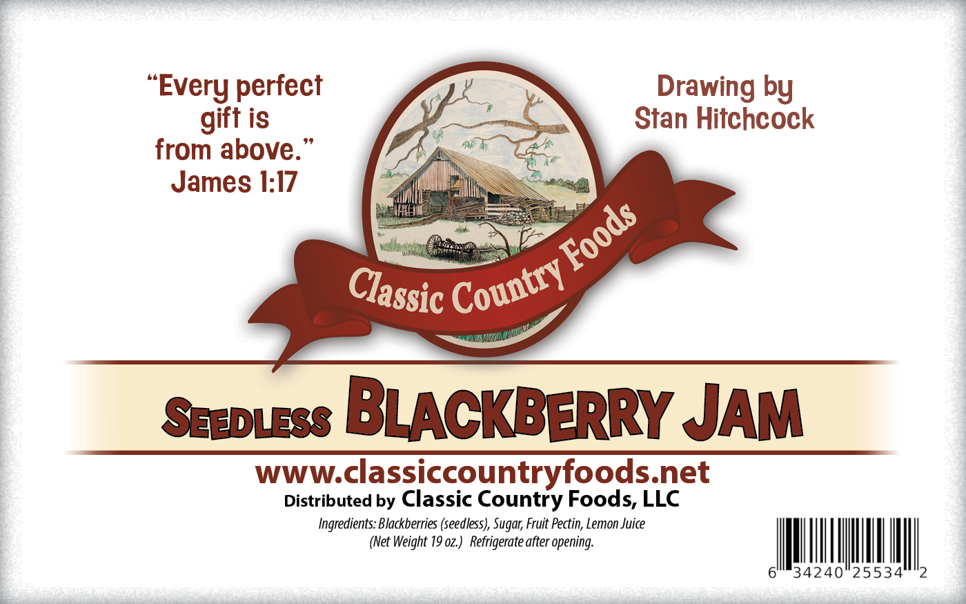 This is an elevated classic flavor (seedless by the straining of the cooked fruit). Made entirely by hand our blackberry jam starts with fresh ripe fruit balanced with the right amount of sugar to enhance, but not overpower, the natural flavor. The mixture is slow boiled over wood fires to achieve the desired thickness. Lemon juice and pectin are added to give the berry flavor brightness and the desired rich texture. Classic Country Food Blackberry Jam is dark in color, silky in texture and perfect for your breakfast table or as an addition to dessert recipes.